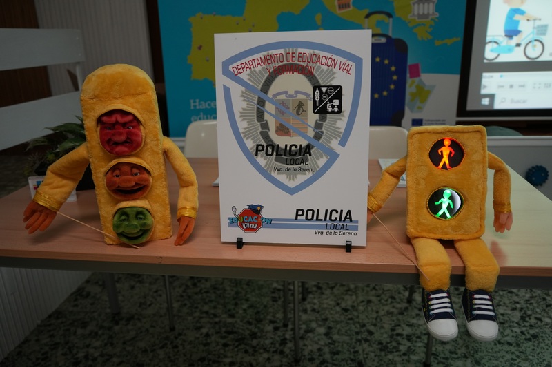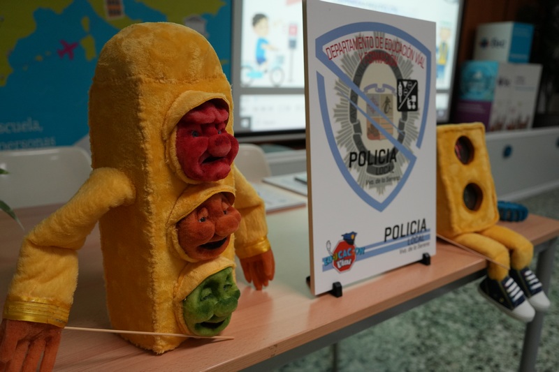 En concreto, las dos marionetas enseñan a pequeños a interpretar los semáforos. Una de las marionetas simula un semáforo peatonal con luces verde y roja, y la otra representa un semáforo completo con las tres fases luminosas (verde, ámbar y roja) asociadas a tres expresiones faciales diferenciadas: muy contento, sonriente y enfadado.