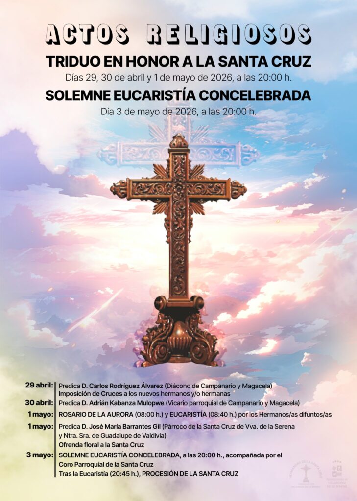 Loa actos religiosos también forman parte de esta programación, del 29 de abril al 1 de mayo se celebra el Triduo en el honor a la Santa Cruz, el 1 de mayo a las 8:00 será el rosario de la Aurora y posterior eucaristía, y el 3 de a las 20:00 tendrá lugar la eucaristía y  a las 20:45se celebrará la procesión de la Santa Cruz.