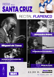 El viernes 1 de mayo se concentran parte de las actividades más populares de estas fiestas, comenzando con el desayuno tradicional en la carpa de la Hermandad a partir de las 9:30 horas, una nueva edición de “Vive tu parque” con diferentes talleres y el concurso “dibuja tu cruz”, la degustación de caldereta al medio día. DJ Sojo amenizará la tarde y a las 22:00 horas habrá un recital flamenco con Miguel de Tena acompañado a la guitarra por Antonio de Patrocinio, y Alejandro Rubio y Francisco Fernández acompañados a la guitarra por Diego de Paula.