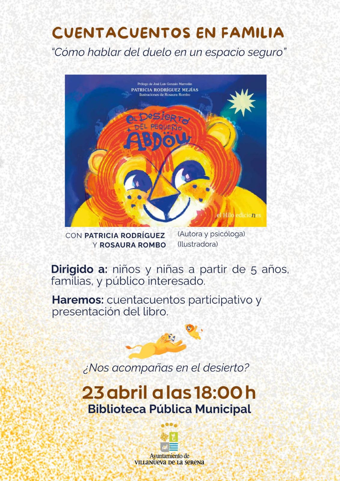 A PARTIR DE 5 AÑOS El desierto del pequeño Abdou es un cuento infantil que acompaña a niños y niñas en las distintas fases del duelo, ofreciendo un espacio seguro donde las emociones pueden ser reconocidas y compartidas. Abdou es un pequeño león que, tras la pérdida de su padre, se adentra en un desierto que representa el vacío, el miedo y la confusión que deja la ausencia. A lo largo de su recorrido, transita por la negación, la rabia, la tristeza y la soledad, y se encuentra con personajes que representan las diferentes formas en que el entorno puede responder al dolor infantil. La historia sitúa la pérdida en el contexto de una partida motivada por la búsqueda de un futuro mejor, incorporando una mirada social sobre la pérdida vinculada a los procesos migratorios, sin perder de vista que el duelo es una experiencia universal que atraviesa a toda la infancia. Con un lenguaje simbólico y accesible, El desierto del pequeño Abdou invita a leer en compañía y a acompañar a niños y niñas en la integración de la ausencia desde el vínculo, la memoria y el amor que permanece y a sostener a la infancia cuando más lo necesita. Si acompañamos en el desierto, la salida es posible.