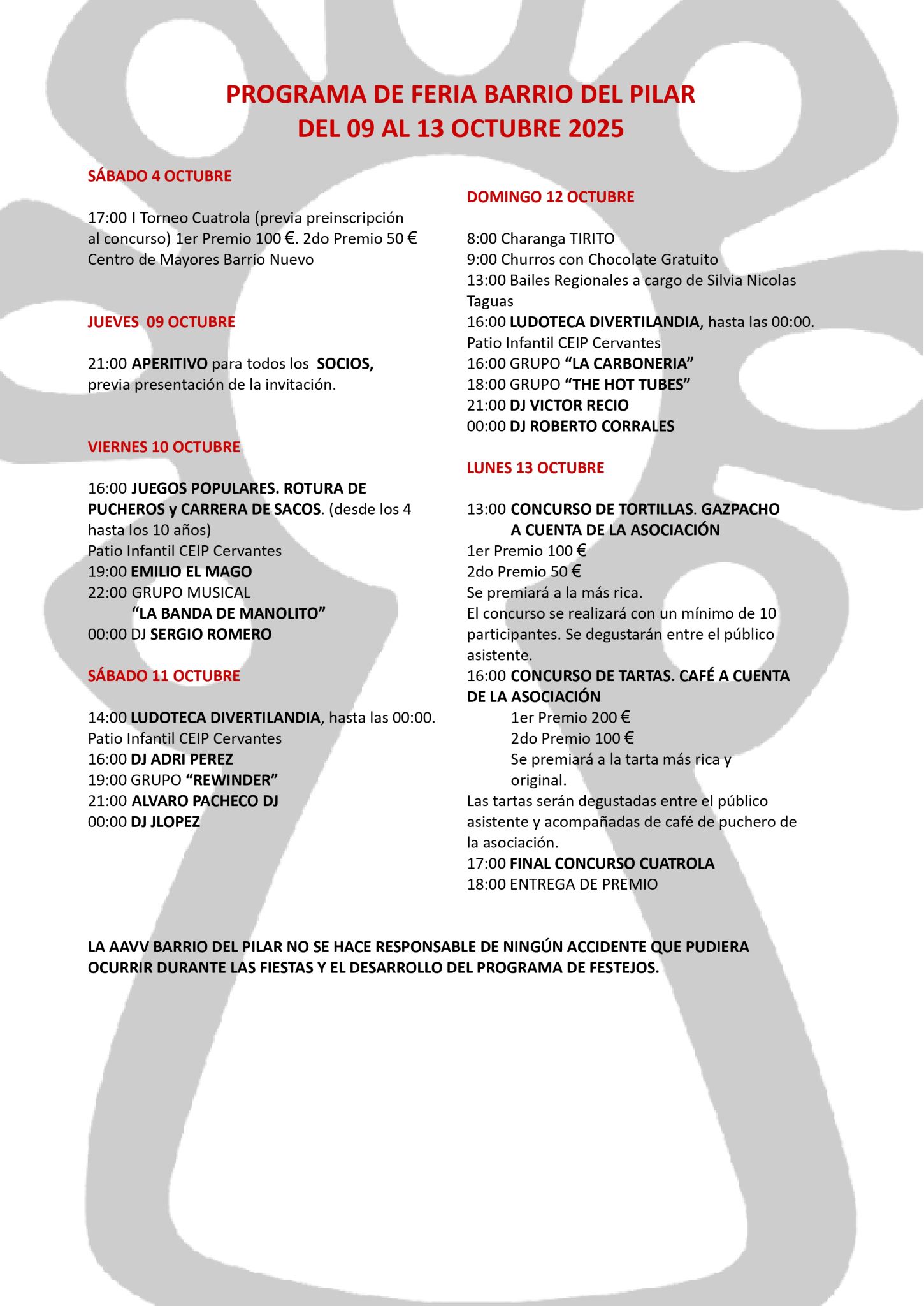 👉ℹ️ Toda la información: https://villanuevadelaserena.es/2025/10/07/las-fiestas-del-pilar-comienzan-este-jueves-9-y-concluiran-el-lunes-13-de-octubre/