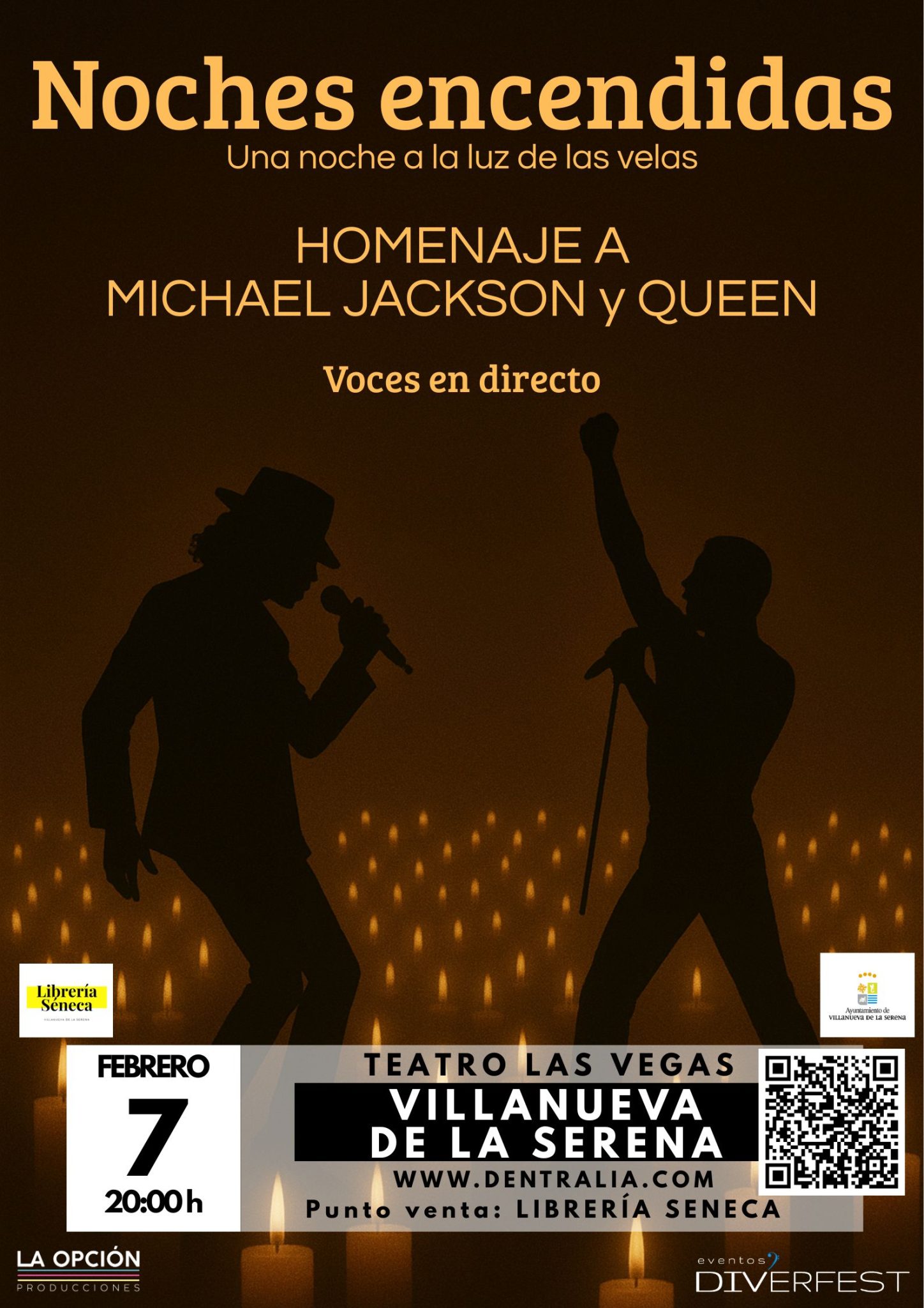 Sumérgete en una experiencia única donde la música y la luz se funden para crear una atmósfera mágica. Noches Encendidas es un tributo íntimo que rinde homenaje a dos leyendas eternas: Michael Jackson y Queen. En un escenario iluminado únicamente por la suave luz de cientos de velas, las voces en directo y los arreglos cuidadosamente interpretados transportan al público a un viaje emocional por los mayores éxitos de ambos artistas.