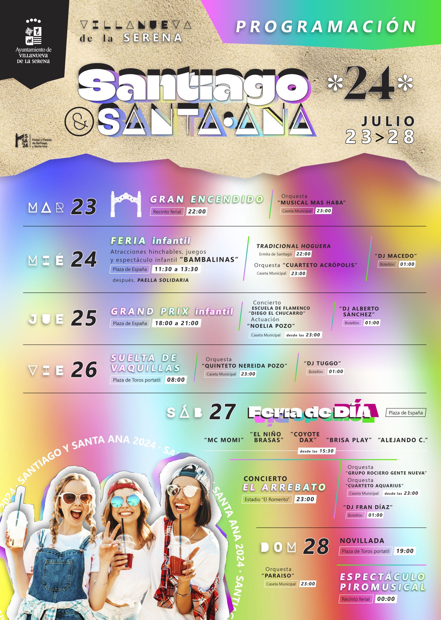 El próximo martes 23 de julio y hasta el día 28, Villanueva de la Serena celebra sus fiestas patronales de Santiago y Santa Ana. Unas fiestas que vienen cargadas de actividades destinadas tanto para los más pequeños como para los adultos. Las fiestas son referente, no solo para los villanovenses sino para muchas personas que disfrutan de ellas. Unas fiestas, recuerda, que hay que disfrutar, pero siempre con respeto y responsabilidad.